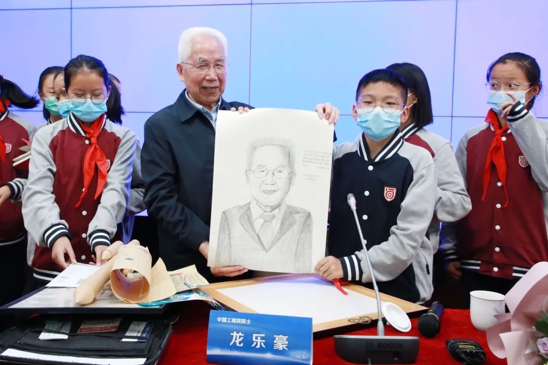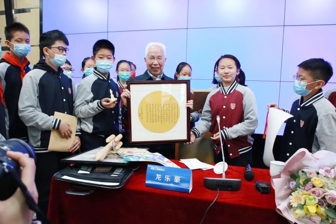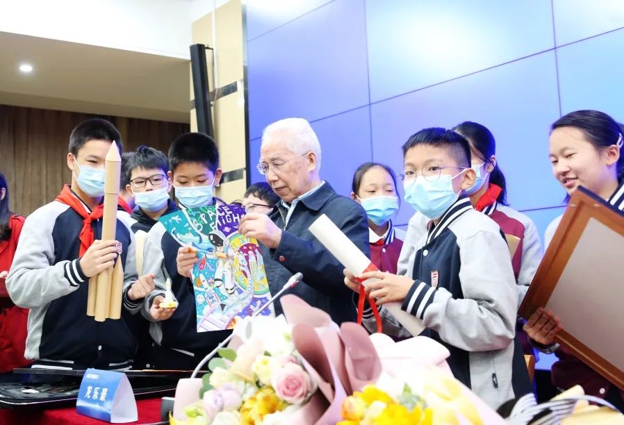 讲座结束后,同学们争相上台赠送给龙院士早已准备好的礼物,有给院士画的画像,有书法作品,有火箭模型,还有黏土火箭等等,院士非常高兴地收下了礼物,并与孩子们亲切合影。