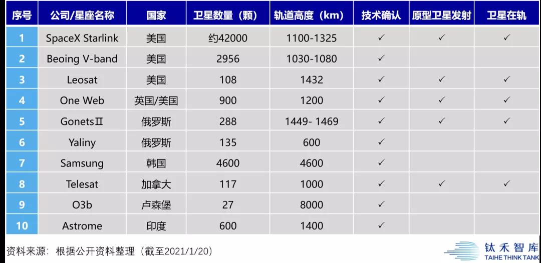 根据公开资料统计,目前全球宣布卫星互联网星座计划的公司超过30家,部署卫星计划达5万颗以上。然而,由于资金、技术、频段资源等各方面条件限制,绝大部分星座目前都处于规划阶段,据航天市场研究咨询公司Northern Sky Research(NSR)2020年预测,大约只有18%的星座能走到发射阶段。