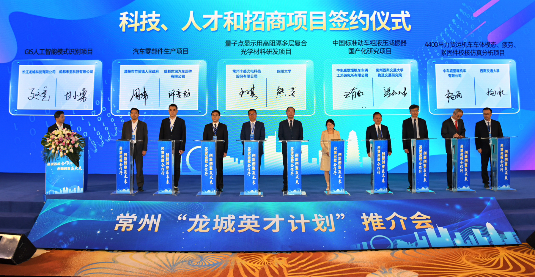 推介会通过介绍短片形式介绍了常州最新的人才和创新政策。高能量密度锂电池项目、电子科技大学-铭丰电子共建联合实验室项目、货运机车车体校核仿真分析项目等15个人才创新创业项目、产学研合作项目及招商引资项目现场签约。常州市还首次在成都11所高校和研发机构中聘请“引才专员”。