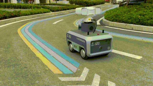 “那边的是安防机器人,可以在商场、危化工厂、供电厂、工业园区、公园、街道以及其它场景中提供安防巡逻服务。如果你在公共场合不戴口罩,它能识别提醒,如果你一直不戴口罩,它就追着你跑。”