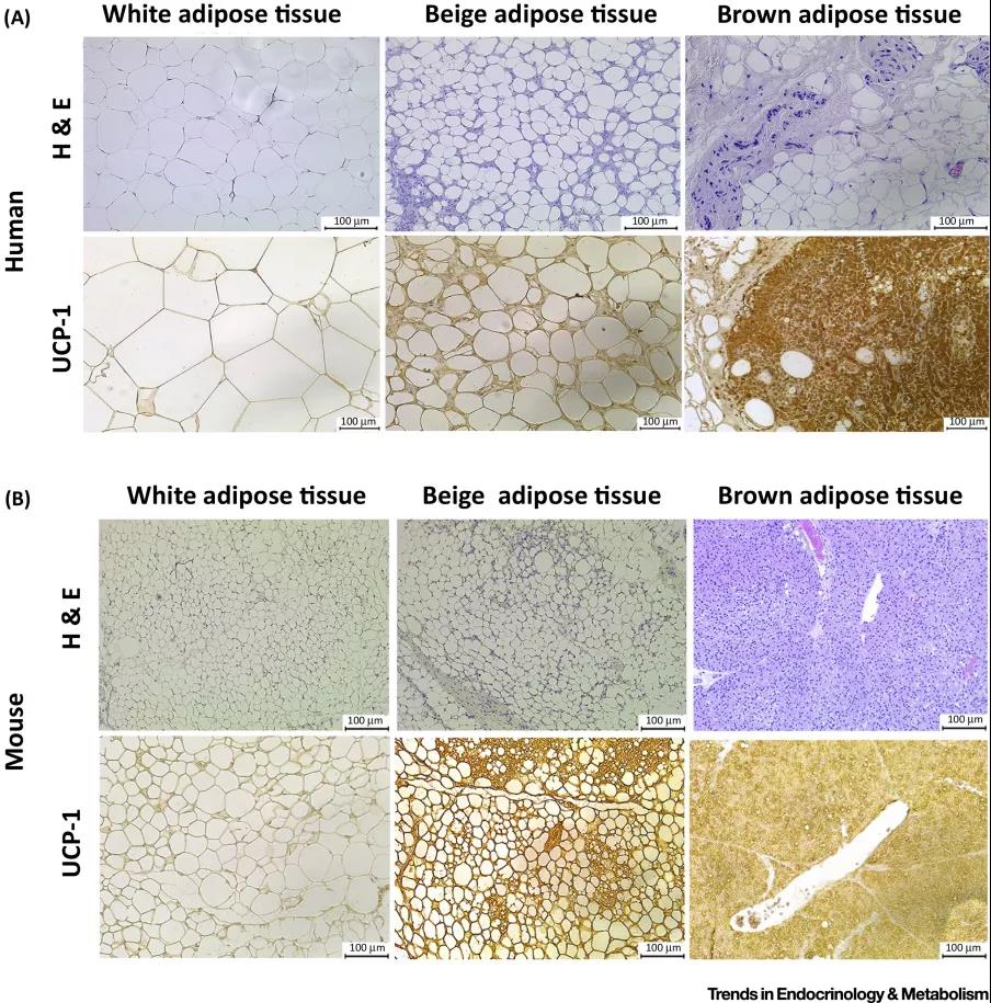 图1 人(A)与小鼠(B)体内不同脂肪组织的形态特征【1】WAT:单房性结构,线粒体少,不表达UCP1;BAT:多房性,大量线粒体,UCP1表达高;米色脂肪组织:兼具WAT与BAT特征,多房性结构,线粒体丰富,表达UCP1。