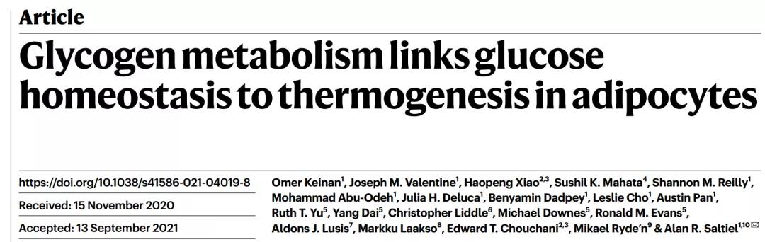 2021年10月27日,加州大学圣地亚哥分校(UCSD)Alan R. Saltiel教授领衔在Nature杂志发表了题为 Glycogen metabolism links glucose homeostasis to thermogenesis in adipocytes 的研究文章,发现脂肪细胞中糖原合成和周转不仅能调节WAT棕色化,还能通过影响 ROS 生成而调节p38 MAPK的活化,继而诱导 Ucp1 和其他产热控制基因的表达,最终调控寒冷等应激状态下小鼠的能量消耗及代谢反应,本研究揭示了糖原代谢调节WAT棕色化及米色脂肪组织产热基因表达与能量消耗的新机制。