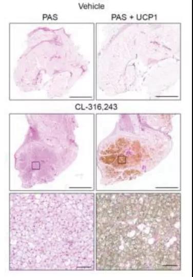 图2 β-肾上腺素信号激活会诱导脂肪组织中糖原积累及UCP1表达