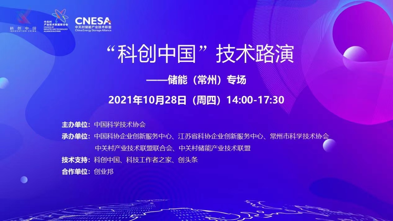 10月28日下午,由中国科学技术协会主办,中国科协企业创新服务中心、江苏省科协企业创新服务中心、常州市科学技术协会、中关村产业技术联盟联合会、中关村储能产业技术联盟共同承办的2021“科创中国”技术路演——储能(常州)专场线上举行,活动通过“科创中国”、科技工作者之家、创响中国、企业创新最前沿、创头条、创业邦等平台宣传推介。中关村储能产业技术联盟秘书长刘为主持本期技术路演。