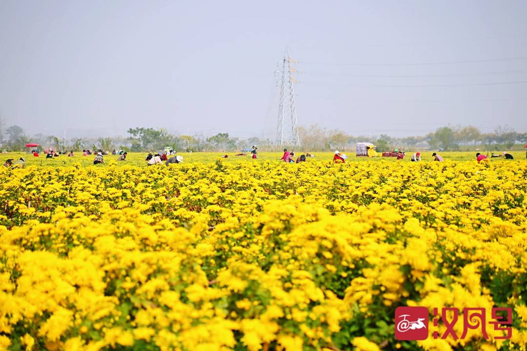11月1日,江苏省徐州市睢宁县桃园镇桃园社区菊花产业园里,20多亩金丝皇菊和130多亩杭白菊有的蓓雷初绽,有的含苞待放,有的迎风怒放,上百名村民正在抓紧采摘新鲜的金丝皇菊和杭白菊。