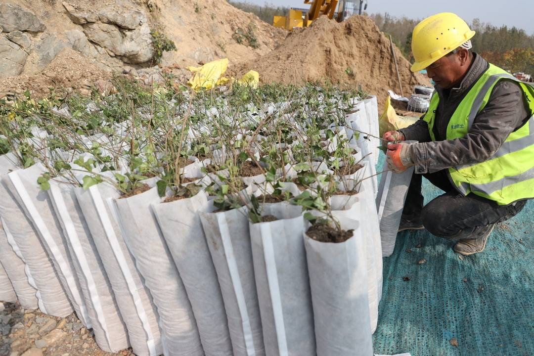 目前安然山生态修复土石方工程已基本结束,绿化工程即将开始。按照规划,安然山修复过程中将种植晚樱、美人梅、垂丝海棠、紫玉兰、桂花等20多种观赏植物,四季有绿、有花、有景。为了让山体真正变绿、变美,施工中利用潜孔钻机在石壁上横向凿出一个个深约70厘米的圆孔,然后再将一个个装满泥土、爬藤类植物和草籽的长袋子填进去。待这些植物全部长出来,整个山体就全部变绿了。刘涛表示,这种覆绿方法虽然成本较高,但安全牢固。如果只是简单的覆土、撒播草籽,虽然一两个月就能长出效果,然而一旦遇到大量雨水冲刷就很可能会流失。