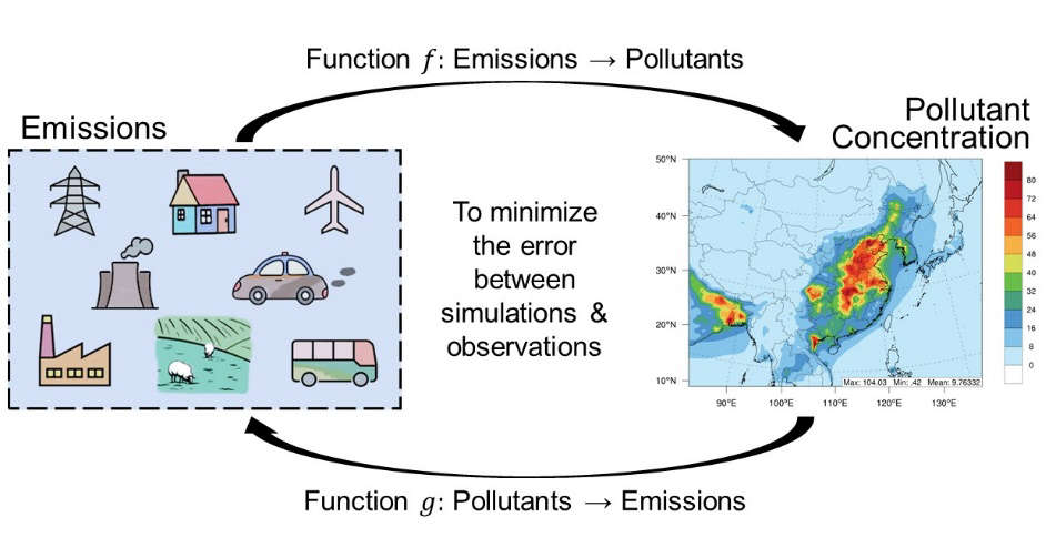 研究员们基于训练好的 NN-CTM 来准确反映排放清单与污染物浓度之间的关系,进而在模型中输入地表和卫星观测的污染物浓度数据,通过误差反向传播的方法来估算新的排放清单。