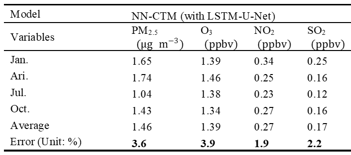 实验结果表明,训练好的 NN-CTM 模型可以很准确地复现大气污染物的数值模拟结果,且误差仅有3%左右,同时模拟速度可达到原数值模型的1000倍。