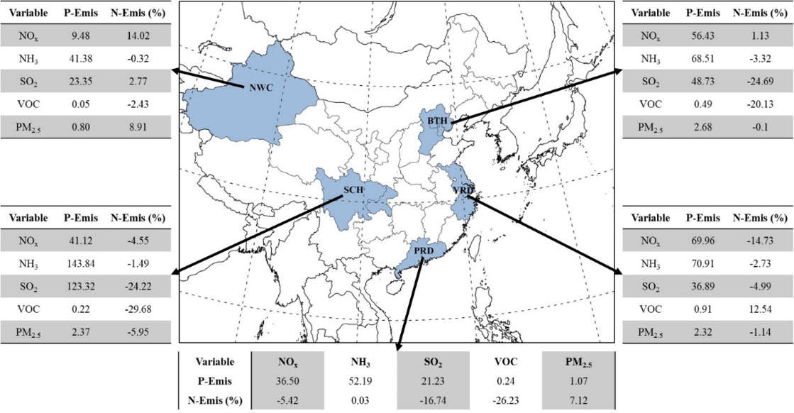 为了进一步分析不同区域的排放变化,研究员们首先选取了5个典型区域:人口密集的京津冀地区(BTH)、长江三角洲地区 (YRD)、珠江三角洲地区(PRD)、四川盆地地区(SCH) ,以及因缺少观测数据而约束条件不足的中国西北部地区(NWC)。并计算了各典型区域内5种排放物4个月的平均排放量在调整前后的变化,如图4所示。