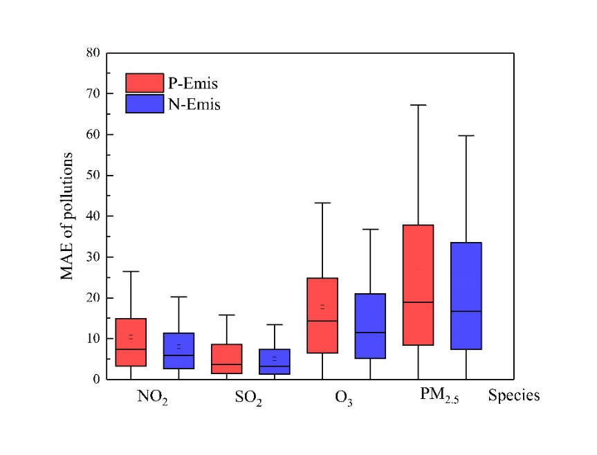 随后,研究员们将使用调整后的排放清单(N-Emis)的污染物浓度模拟值与612个观测站的数据进行对比,发现NO2、SO2、O3 和 PM2.5 浓度的平均绝对误差(MAE)分别从7.39降低至5.91(20.03%)、3.64降低至3.22(11.54%)、14.33降低至11.56(19.33%)ppbv 和从18.94降低至16.67 (11.99%) μg m-3。结果证明了 N-Emis 的可靠性及本研究应用机器学习方法的实用性。(注:括号内数值为降低率。)