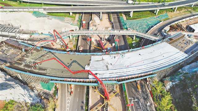 10月5日,西部(重庆)科学城科学大道一期青龙咀立交施工现场,工人正在进行混凝土浇筑。