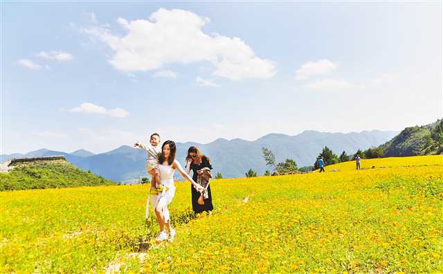 10月3日,游客在酉阳花田乡何家岩村万寿菊花海拍照游玩,赏花看景,乐享假期。 通讯员 邱洪斌 摄/视觉重庆