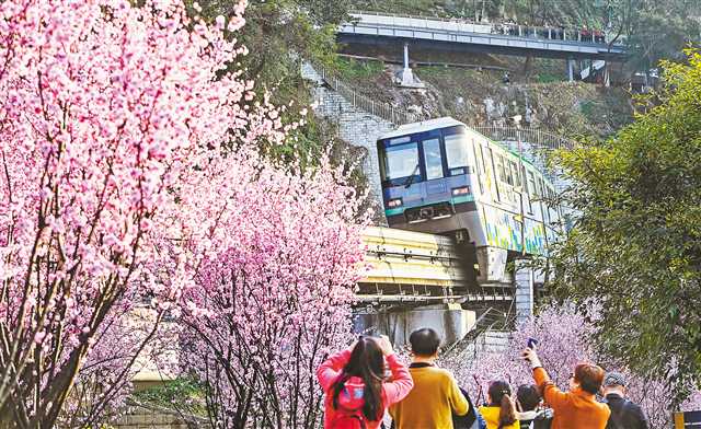 2月19日,重庆轨道交通2号线佛图关、一号桥、两路口、黄花园大桥北等地段花开正艳。首席记者 龙帆 摄/视觉重庆