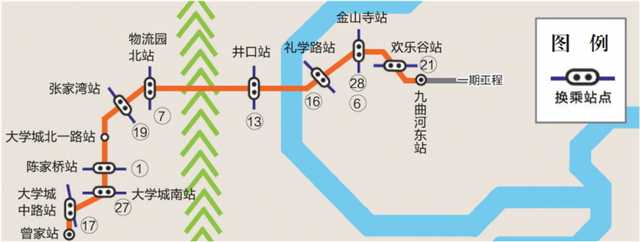 据介绍,15号线二期沿线将与10条轨道交通线路换乘(见图表),包括:大学城中路站与规划17号线换乘,大学城南站与同期27号线换乘,陈家桥站与运营1号线换乘,张家湾站与远期规划19号线换乘,物流园北站与规划7号线换乘,井口站与远景规划13号线换乘,礼学路站与远期规划16号线换乘,金山寺站与运营6号线、远期规划28号线换乘,欢乐谷站与运营21号线换乘。