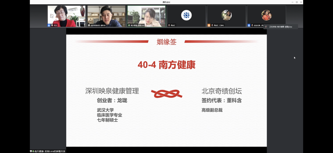 致辞结束后,在嘉宾、项目方与云端观众的见证下,开启了一场别开生面的产融双方“线上婚礼”。南方健康项目与奇绩创坛在武汉创业红娘公益服务中心理事长刘玉的主持下,正式签约合作,并公示了双方合作的投资金额。南方健康项目代表龙珑通过线上表示,此次合作要感谢创业红娘平台的牵线搭桥,双方将在相关领域共进退、创新高,突破行业新瓶颈。奇绩创坛代表董科含也表示,对南方健康项目十分看好,未来双方强强联手,借助创业红娘、海创汇等平台,一定会展现别样的风采。