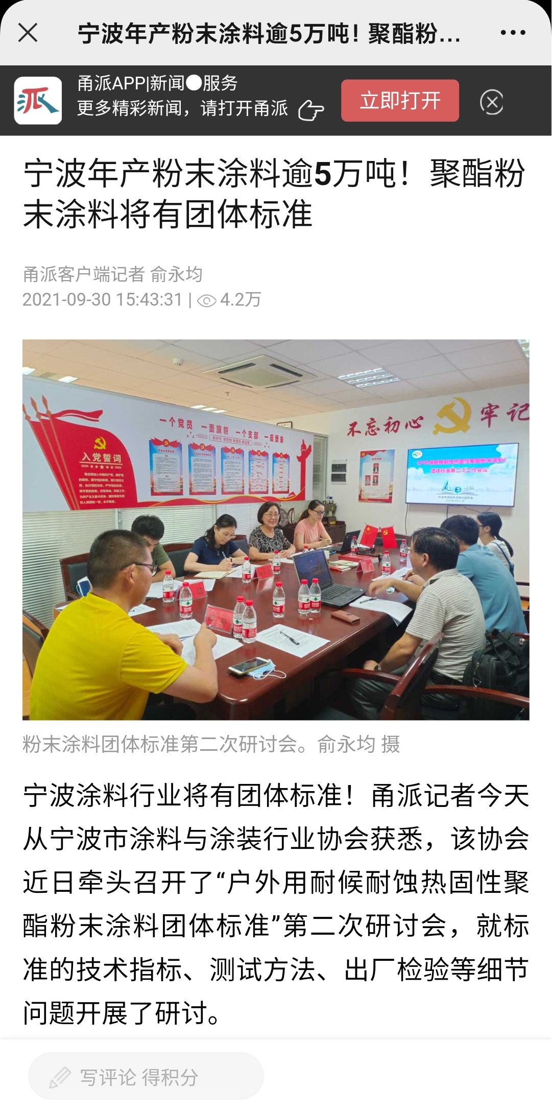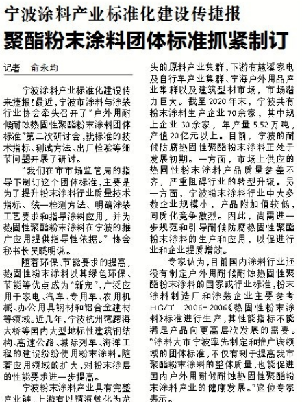 9月30日和10月9日,《户外用耐候耐蚀热固性聚酯粉末涂料》团体标准工作分别在《宁波日报》和甬派APP上刊登。宁波市涂料产业标准化建设工作受到了公众的认可与关注,也进一步说明协会的标准化工作落在实处,扩大了协会的知名度和影响力。