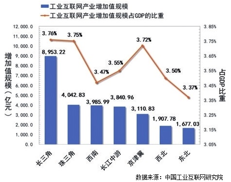 从工业互联网产业增加值规模占GDP的比重来看,长三角地区工业互联网产业增加值规模占GDP的比重最高,达到3.76%;珠三角地区和京津冀地区分别为3.75%和3.72%;长江中游地区、西北地区、西南地区、东北地区紧随其后。白皮书显示,2020年我国主要功能区域均保持较高增速,除受疫情影响较大的长江中游地区以外,其余重点区域均保持在10%以上,工业互联网赋能区域效果显著。