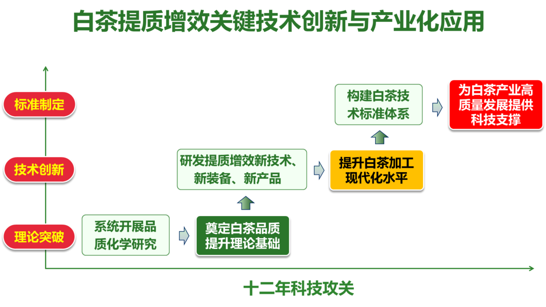 白茶是我国传统六大茶类之一,近十年白茶产业快速发展,已成为广大白茶产区农民脱贫致富和乡村振兴的支柱产业。中国农业科学院茶叶研究所茶叶品质化学与营养健康创新团队与福建农林大学等单位合作,针对制约我国白茶产业发展过程中风味品质基础理论研究薄弱,加工技术和装备落后、产品种类单一、生产技术规范与标准缺乏等长期技术瓶颈,开展研究攻关,完善了白茶风味品质形成的理论基础,研发了一系列白茶提质增效关键新技术、新装备与新产品,构建了白茶产业立体化标准体系,实现了白茶产业的提质增效和高质量发展。