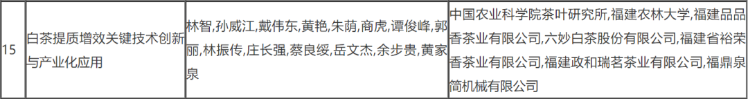 该项目共获授权发明专利10件,实用新型20件,软件著作权3件;制定标准9项,其中国家标准3项;发表论文32篇,其中JCR一区SCI收录13篇。该项目整体技术居国际领先水平,在白茶主产区进行推广应用,累计新增销售额 20.91亿元,新增利润3.48亿元,带动1.47万农户增收,其中近两年新增销售额9.44亿元,新增利润1.64亿元。在促进当地经济发展、茶农增收和乡村振兴,推动我国白茶产业技术进步等方面取得了显著的社会经济效益。
