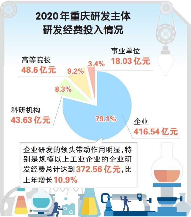 《公报》显示,整个“十三五”时期,重庆研发经费始终保持两位数增长。企业、科研机构、高等学校和事业单位,是全市开展研发活动的主体。市统计局负责人介绍,去年全市企业、科研机构、高等院校、事业单位分别投入研发经费为416.54亿元、43.63亿元、48.6亿元、18.03亿元,占全市研发经费比重分别为79.1%、8.3%、9.2%、3.4%,企业研发的领头带动作用明显,特别是规模以上工业企业的企业研发经费总计达到372.56亿元,比上年增长10.9%。