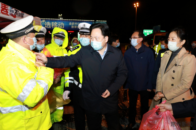 走访慰问中,陈金虎向所有奋战在抗疫一线的工作人员表示衷心感谢。他强调,当前常州疫情防控仍处在最吃劲最关键时期,要压实“四方责任”、落实“四早”要求,强化指挥调度,加强统筹协调,确保第一时间发现问题、解决问题。要严格落实道路交通道口的查验管控要求,配足配齐力量,加强离常人员查验工作,做到逢人必测、逢车必检,不放过一个不合防疫规定的人员。要继续发扬勇于担当、不怕艰苦、连续作战的精神,坚守工作岗位,落实落细各项防控措施。要毫不松懈抓好寒潮天气下的疫情防控工作,提前制定预案,确保生活物资供应充足。相关部门要提前做好道路清冰雪、防湿滑的准备工作,确保道路交通运行安全有序。