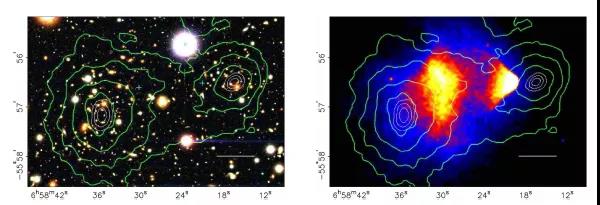 图7:子弹头星系团(bullet cluster)(1E0657-56):左图为光学图象,右图为X-射线图象。