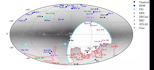 图8.已发现的银河系卫星星系(图中标注了发现该卫星星系的巡天)[10]