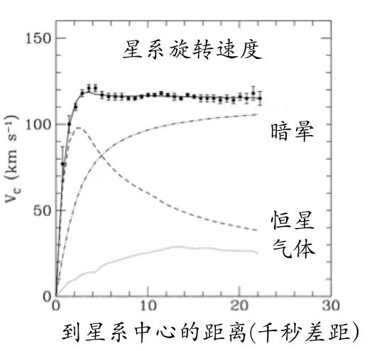 但是到了上世纪70年代,人们观测了我们所处的银河系和很多其它星系的旋转曲线——也就是到星系中心不同距离处的恒星或气体的旋转速度值。恒星或气体的旋转速度应该与它们受到的引力有关,星系中心的恒星密度较高,而越到边缘其恒星密度越低,再加上离中心距离更远,因此距离中心越远处受到引力应该越低,那么其旋转速度也应该越慢。但是,实际观测的结果并非如此,星系旋转曲线大多趋于一个常数,这就是所谓的“平坦旋转曲线”(图2)。甚至,人们使用射电望远镜还可以观看星系的中性氢气体的旋转气体,在星系中这些气体的分布范围比恒星所形成的盘要大不少,因此可以看到这些气体所处的边缘已经几乎没有恒星了,而且这些气体本身的量也不多,按理说这里的引力应该下降了,但是这些气体的转速仍然不下降。