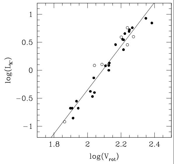 一个好的科学理论,不仅应该能够解释一种现象,而且最好能用同一理论对多种现象给出解释;不仅应能解释已知的现象,而且最好能预测未知的现象,并得到实验或观测的证实。密尔格罗姆发现,使用MOND理论,不仅可以很好地拟合星系的旋转曲线(预测其值趋近于一个常数),而且可以预测,这个旋转速度曲线最后速度的4次方正比于星系中我们观测到的普通物质的质量。而这一点,也得到了后续观测的很好证实。就在这一时期,天文学家Tully 和Fisher发现,星系的光度与其旋转速度之间存在 L~v4 的关系。如果做出最简单的假定,即星系的光度与其发光物质的质量成正比,那这一关系就完全可以用MOND来解释。相比之下,暗物质模型对Tully-Fisher关系的解释就复杂得多。虽然暗物质模型中,也可以假定星系的一切均受其暗晕质量影响,包括其普通物质的质量、星系的光度和旋转速度都随着暗晕质量增加,因此也能在旋转速度与光度之间找到某种关系,但在最简单的假设下得到的关系是L~v2。而且,在暗物质理论中,这些量之间虽然互相关联,但它们之间并没有严格确定的联系,因此预期这种关系应该有相当大的弥散;而按照MOND理论,这种关系应该是比较精确而没有太大误差的。实测的结果,是这一关系确实比较精确地成立(图5)。