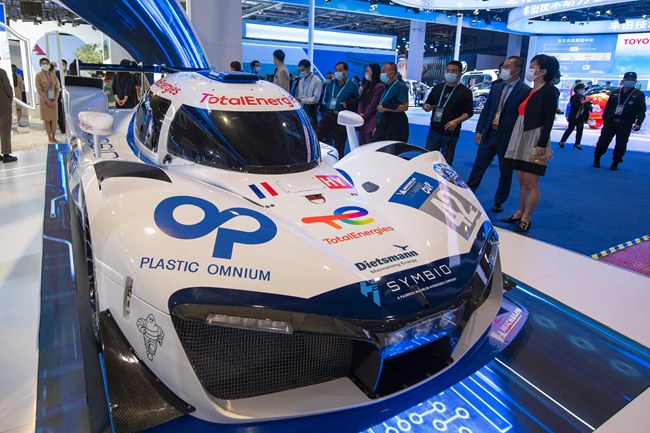11月5日,在进博会汽车展区,全球首辆氢能源耐力赛赛车吸引众多参观者目光。人民网记者翁奇羽 摄