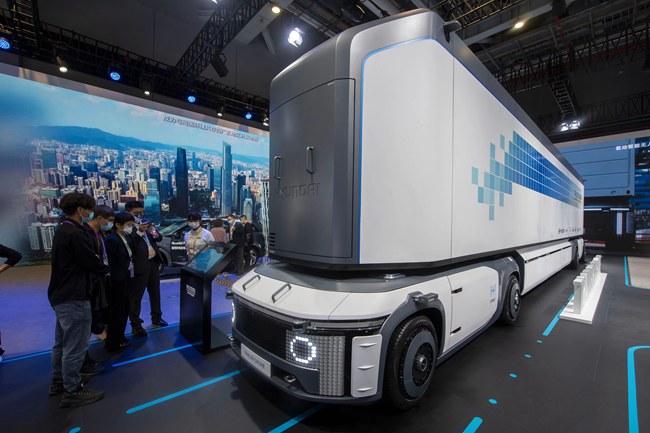 11月5日,在进博会汽车展区的现代展台,参观者对在中国首秀的氢动力智能无人运输车非常感兴趣。人民网记者翁奇羽 摄