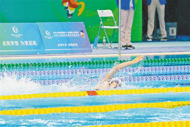 10月23日下午,全国第十一届残疾人运动会暨第八届特奥会女子S14级200米自由泳决赛中,来自重庆的运动员曹艺桐以2分23秒42的成绩摘得银牌,并打破了该项目的全国纪录。截至目前,重庆代表团在本次残特奥会已收获13.5金、18银、16铜。图为曹艺桐在比赛中。