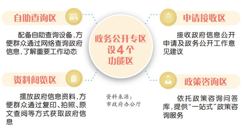 据介绍,依托政务服务场所建设的政务公开专区分为自助查询区、资料阅览区、申请接收区、政策咨询区等4个功能区。依托国家档案馆、公共图书馆建设的政务公开专区分为自助查询区、资料阅览区两个功能区。