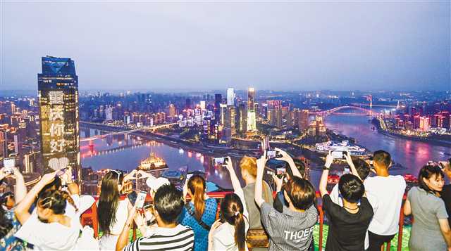 游客在解放碑“云端之眼”高空观景平台拍摄夜景。(重庆日报资料图片)记者 苏思 摄\视觉重庆