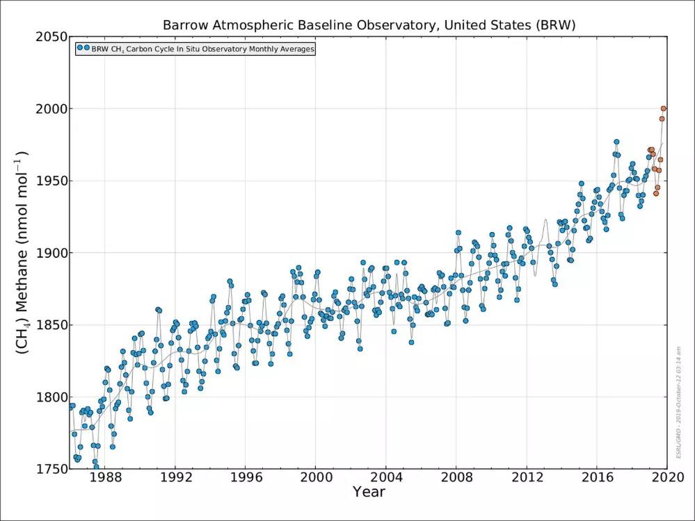 1988年-2020年美国巴罗大气基线观测站(Barrow Atmospheric Baseline Observatory)对于北极地区的甲烷(CH4)浓度的观测数据(数据来源:NOAA)