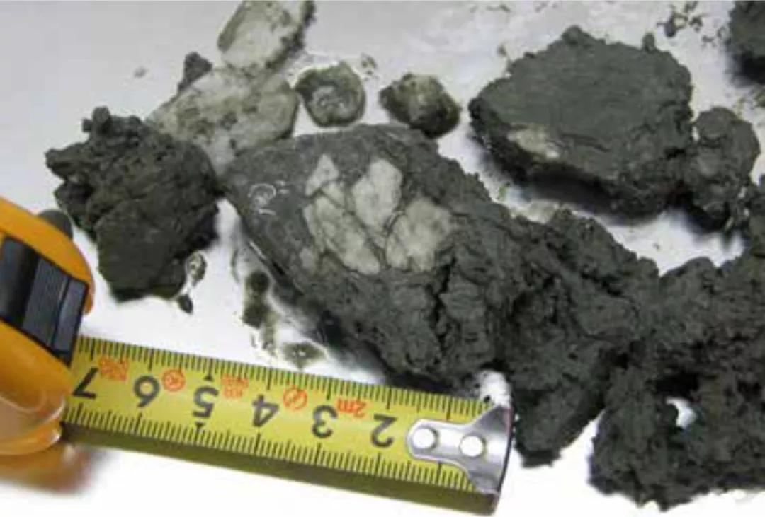 在日本海发现的天然气水合物结节 (白色)。(图片来源:Frozen heat: a global outlook on methane gas hydrates - Volume 1;照片由韩国地球科学和矿产资源研究所提供)