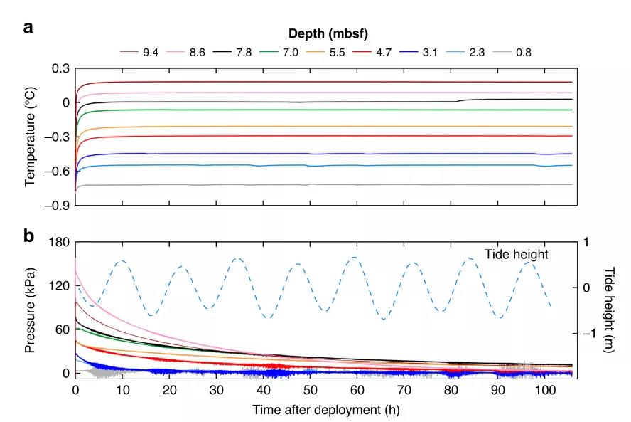 北冰洋海底沉积物孔隙中a温度,b压力随时间的变化曲线。不同的颜色表示测压仪插入海底的不同深度。