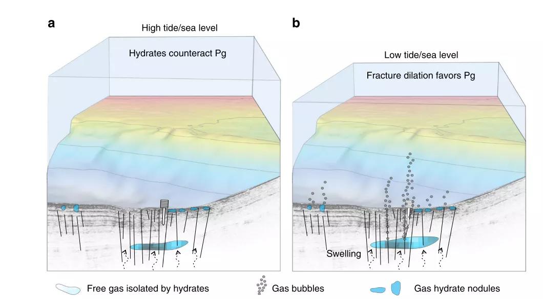 水合物裂隙张开过程中潮汐对气体排放影响的示意图模型。在a涨潮时,系统处于压力平衡;在b低潮时,微小的裂隙扩张使压力场向有利于气体释放的情形转化。