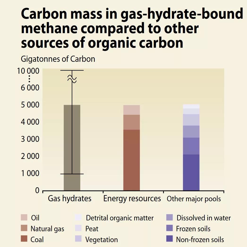 与其他有机碳源相比,天然气水合物甲烷的碳质量。(图片来源:Frozen heat: a global outlook on methane gas hydrates - Volume 1)