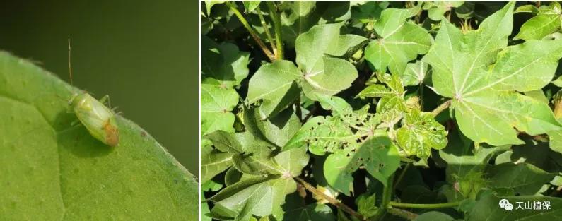 从左到右依次为:绿盲蝽;棉叶被害状(图片来源:天山植保)