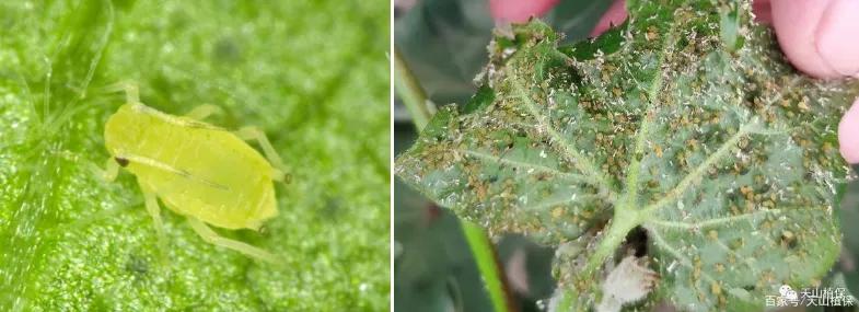 从左到右依次为:无翅棉蚜;棉叶被害状(图片来源:天山植保)
