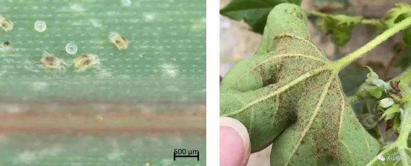 从左到右依次为:棉叶螨;棉叶被害状(图片来源:天山植保)