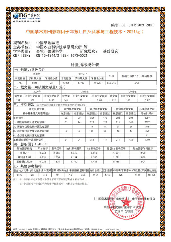《中国草地学报》作为我国历史最悠久的草学期刊,自1979年创刊以来,始终坚持展示我国草学研究的最新成果,始终坚持反映我国草业学术研究的最高水平,始终坚持报道我国草业科学领域发展的最新动态。根据2021版中国学术期刊影响因子年报(自然科学与工程技术),《中国草地学报》2021年影响因子继续提升:复合影响因子2.355(较上一年增长11.13%),综合影响因子1.874 (较上一年增长16.39%),复合影响因子在畜牧、兽医科学学科期刊中排名继续稳居第二。