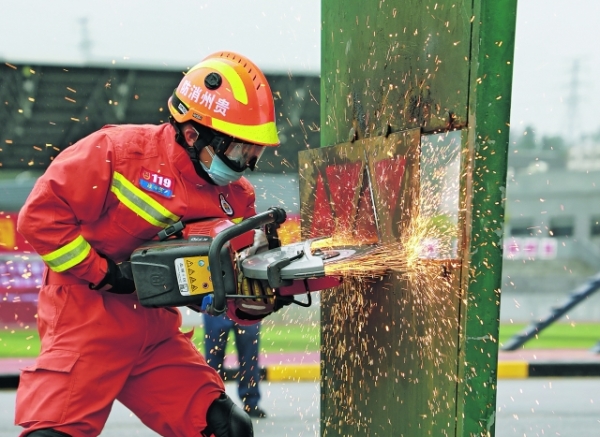 图为参赛队员在综合救助操项目中用无齿锯破拆防盗门。