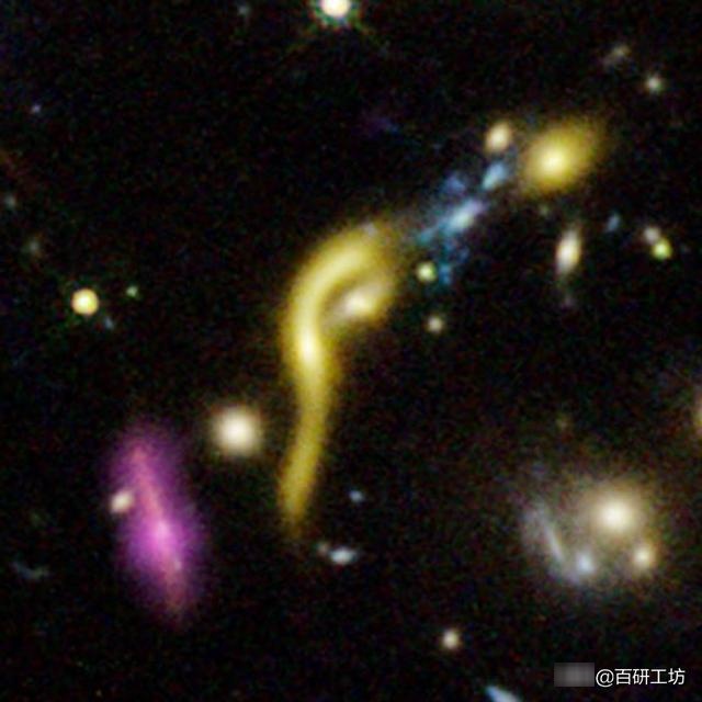 ALMA 的数据显示,六个星系中有四个没有可探测到的尘埃,而在其他两个星系中探测到微乎其微的尘埃。该图显示了来自 ALMA 和哈勃太空望远镜的 REQUIEM 目标之一的合成图像。透镜星系是画面中心的弯曲物体。ALMA 信号以紫色显示,仅从视野中的其他物体发出。