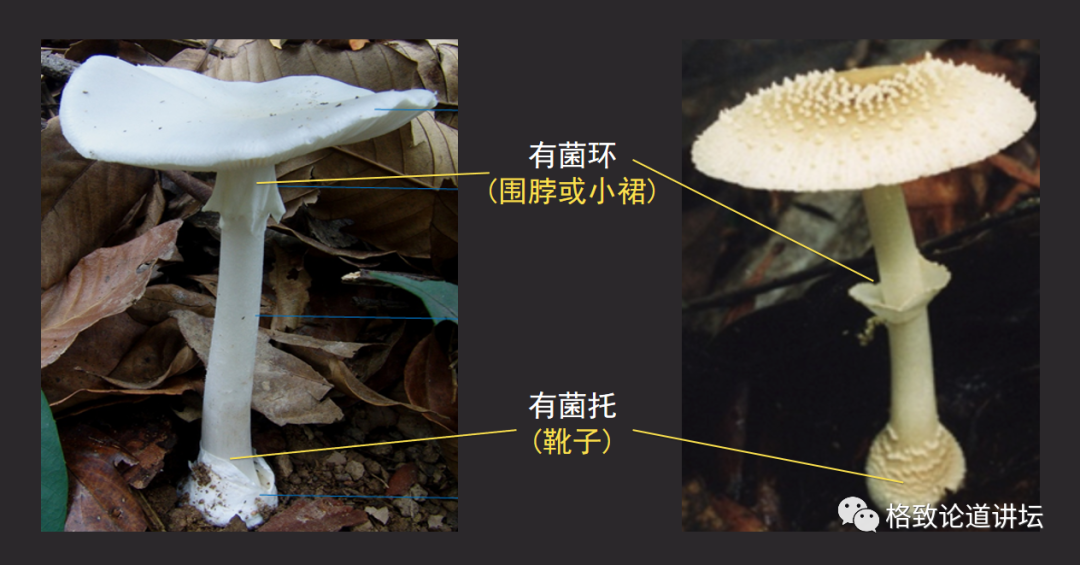 鹅膏菌是一种典型的蘑菇,有一个菌盖和一个菌柄;菌柄上面有一个菌环,像一个小裙子;菌柄的基部有一个杯状的菌托,形象地说就是穿着一只靴子。所以大家要记住,同时穿着小裙子和靴子的就是鹅膏菌种类。看到这种蘑菇不要轻易采食,因为全世界90%的蘑菇中毒死亡的人都是这个类群引起的。