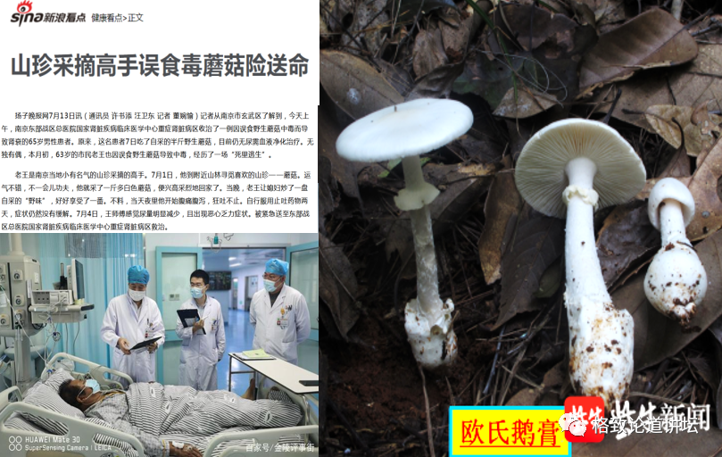 右图这种蘑菇就是有肾衰竭型毒性的欧氏鹅膏。关于欧氏鹅膏也有一个故事:去年南京有一个王师傅,他号称是山珍采摘高手,经常上山采野菜、野蘑菇吃。某天他又采摘了野蘑菇并让他老婆煮好给他吃,他以为今天采到好东西了,结果6到12个小时内,毒性就发作了。发作后越来越辛苦,自己吃点药解决不了,就被送到了东部战区总医院。那里的医疗条件比较好,把他抢救过来了。这个“高手”在鬼门关转了一圈回来,这转鬼门关的能力也算是一个“高手”,我们一般人做不到就别尝试了。