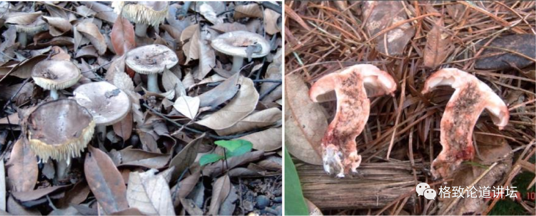 刚才我们认识了鹅膏:有一个菌盖、菌柄,同时有菌环和菌托的就是鹅膏。鹅膏这一种类很危险,占了全世界90%的蘑菇中毒死亡人数。在我国,还有一种蘑菇引起的死亡人数仅次于鹅膏,叫做亚稀褶红菇,这个红菇的菌柄比较粗,颜色是灰色的,受伤后变红色,长在松树和壳斗科植物的混交林下,也是一种菌根菌。