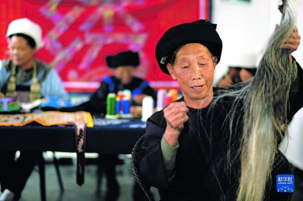 为使搬迁群众搬得出、能致富、奔小康,近年来,贵州三都水族自治县依托水族非遗“马尾绣”,采取“合作社+技能培训+手工艺人”的模式,把社区移民妇女培养成“绣娘”,带动群众通过传统手工刺绣发展“指尖经济”,增加收入。