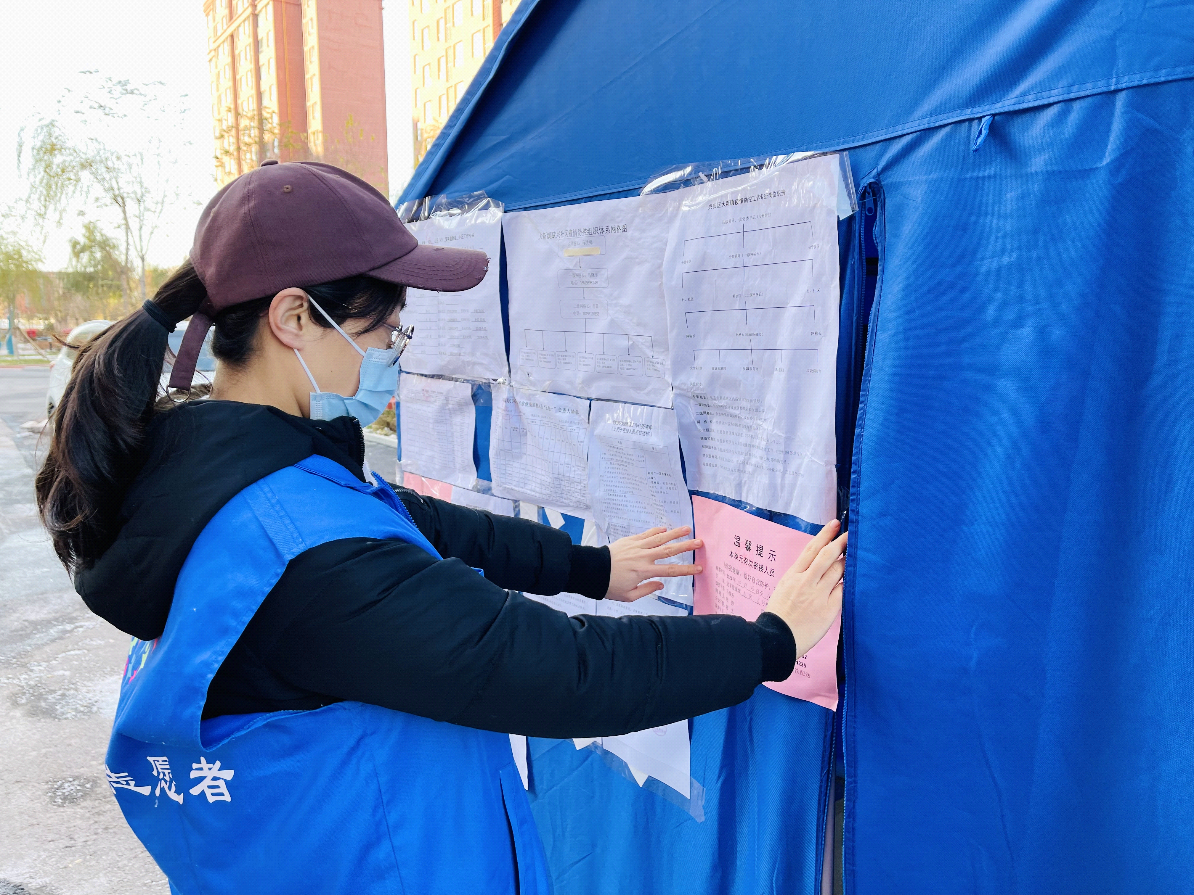 “风雪虽冷,心却火热”。11月6日,一场寒潮席卷宁夏大地,大雪纷飞,气温骤降,虽然寒意袭人,但中心的志愿者们依然在风雪中坚守,奔波在战疫一线,扎牢帐篷、运送物资、消毒巡查,一丝不苟地开展防控工作,一袋袋蔬菜、一个个快递、一盒盒美食……他们向居民送去的不仅仅是生活用品,还有那一份份坚定的信念,让社区居民感到了冬日的暖阳、看到了胜利的曙光,以实际行动诠释了共产党员的初心使命。